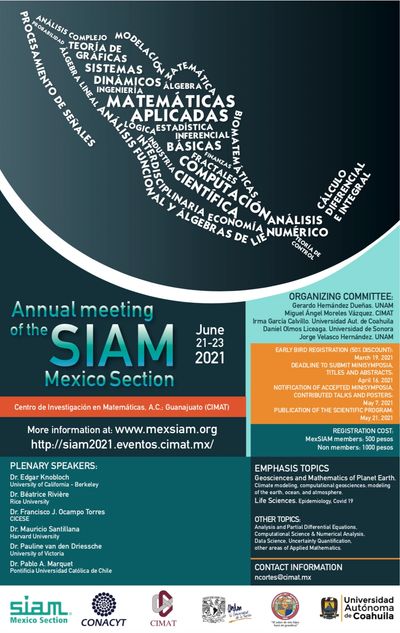 We are delighted to announce the MexSIAM Annual Meeting 2021, to take place from June 21st to 23rd. The Annual Meeting aims to offer a platform for applied scientists from different institutions to interact. There will be plenary and contributed talks, parallel sessions and posters presentations for researchers and graduate students to present their work.